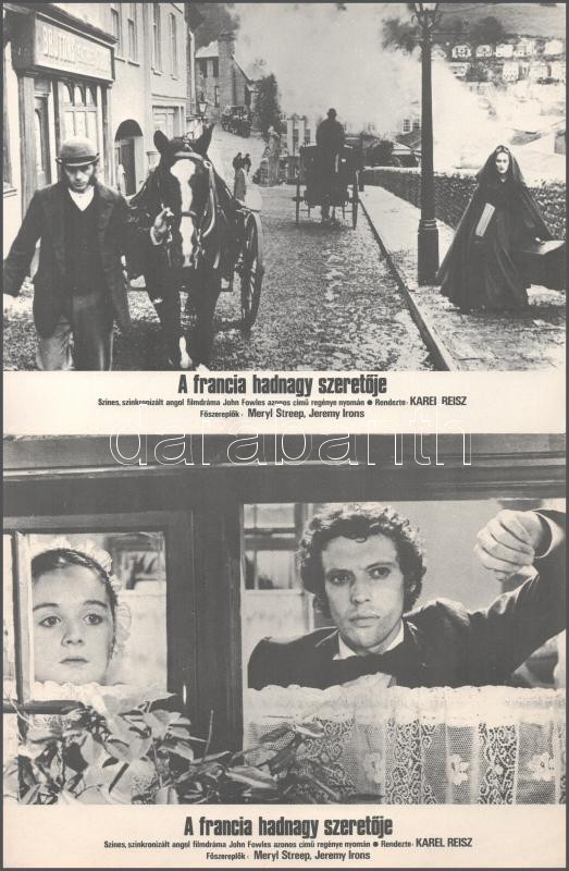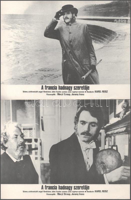 Description: cca 1989 előtt készült, "A francia hadnagy szeretője" című angol film jelenetei és szereplői, 11 db produkciós filmfotó (vitrinfotó, lobbyfotó) nyomdatechnikával sokszorosítva kartonpapírra, egyoldalas nyomással, a használatból eredő (esetleges) kisebb hibákkal, 18x24 cm