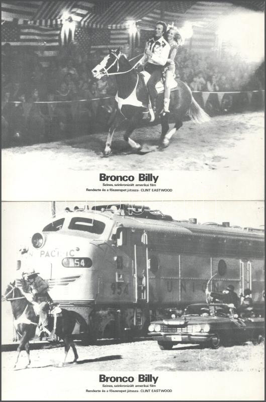 Description: cca 1989 előtt készült, "Bronco Billy" című amerikai film jelenetei és szereplői (főszereplő Clint Eastwood), 9 db produkciós filmfotó (vitrinfotó, lobbyfotó) nyomdatechnikával sokszorosítva kartonpapírra, egyoldalas nyomással, a használatból eredő (esetleges) kisebb hibákkal, 18x24 cm