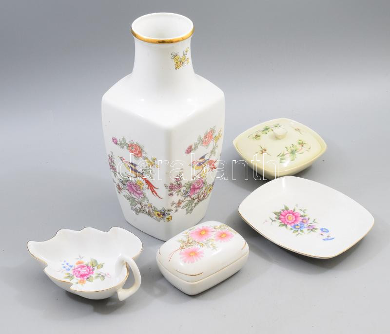 Hollóházi 5 darabos összeállítás, közte paradicsommadár mintás váza, m: 24,5 cm