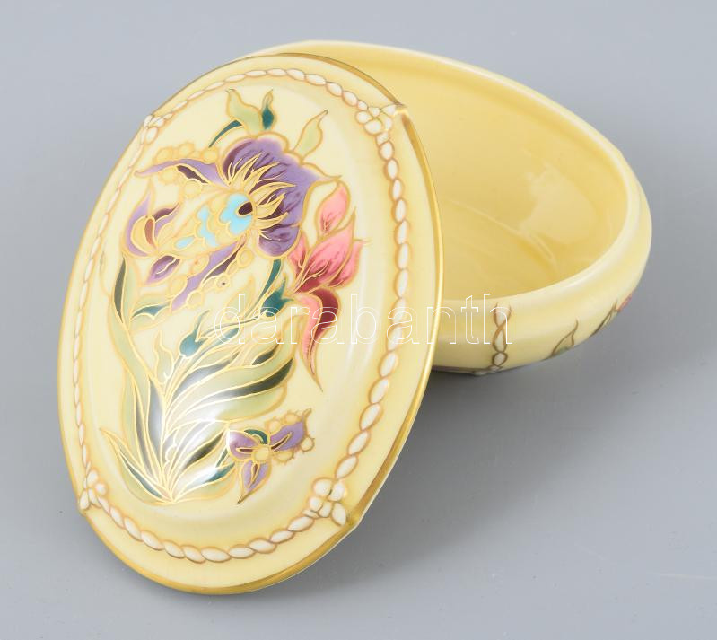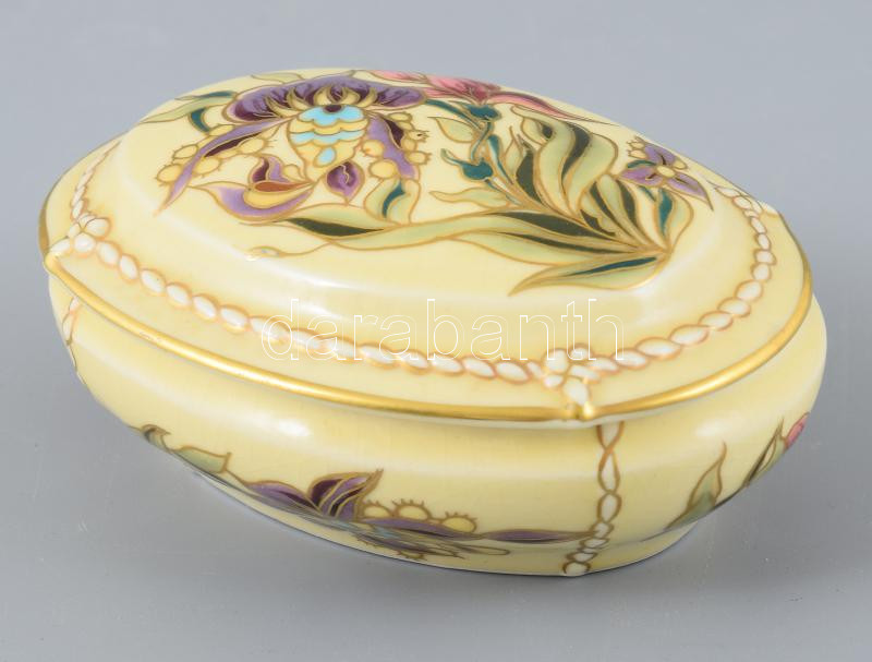 Zsolnay aranykontúrozott virágmintás bonbonier, jelzett, 10,5x7,5 cm