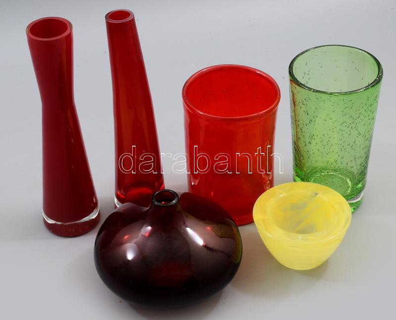 6 darab mid-century anyagában színezett üvegtárgy, közte buborékos anyagú hutaüveg, hibátlan, m: 21 cm alatt