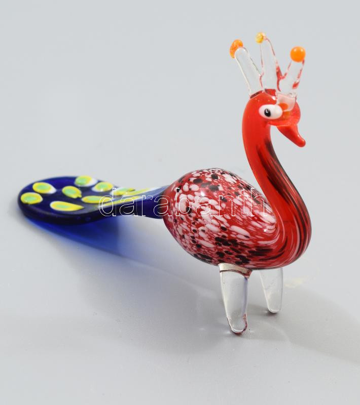 Iparművész fújt üveg páva, anyagában színezett, hibátlan, 9x7,5 cm