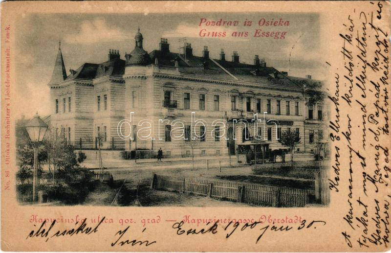 1900 Eszék, Essegg, Osijek; Kapucinska ulica gor. grad. / Kapuzinergasse, Oberstadt / street view, palace. Ottokar Rechnitzer No. 86. (EK)