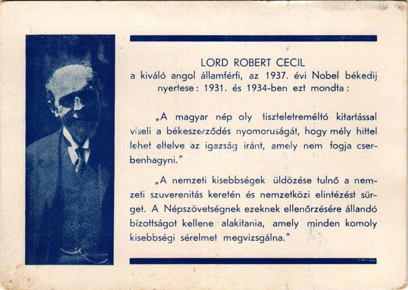 Lord Robert Cecil, az 1937. évi Nobel békedíj nyertese. A Magyar Nemzeti Szövetség kiadása / Hungarian irredenta propaganda (EB)