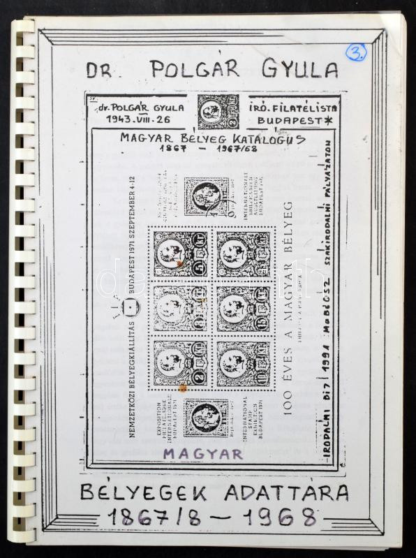 Dr. Polgár Gyula: A magyar bélyegek adattára 1867/8-1968, másolt oldalak lefűzve