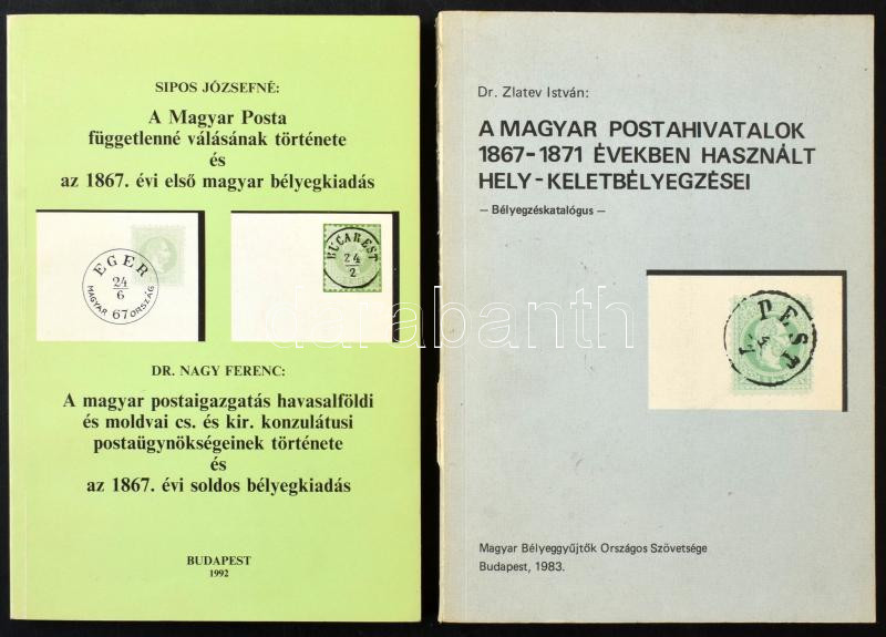 Dr. Zlatev István: A magyar postahivatalok 1867-1871 években használt hely-keletbélyegzései (1983) + Sipos Józsefné: A magyar posta függetlenné válásának története és az 1867. évi első magyar bélyegkiadás / Dr. Nagy Ferenc: A magyar postaigazgatás havasalföldi és moldvai cs. és kir. konzulátusi postaügynökségeinek története és az 1867. évi soldos bélyegkiadás (1982)