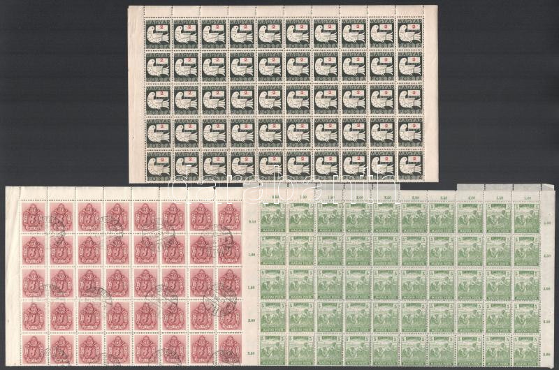 1919-1946 Magyar Posta 5f, Barnaportó (I.) 3f és Billiós 2BP hajtott 100-as ívekben (fogelválások / aparted perfs.)