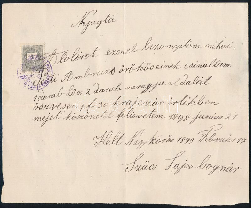 1898 Nagykőrösi nyugta okmánybélyeg helyett 1kr postabélyeggel