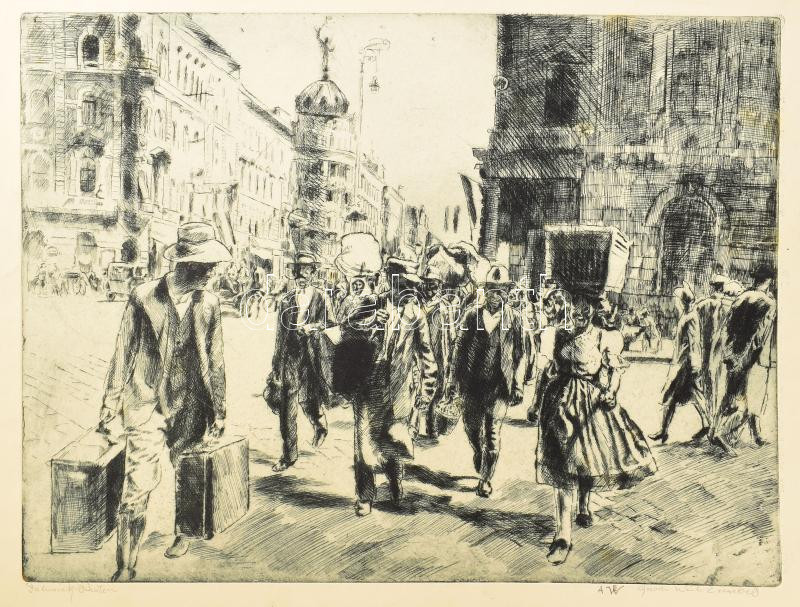 Aszódi Weil Erzsébet (1901-1976): Falusiak Pesten. Rézkarc, papír, jel...