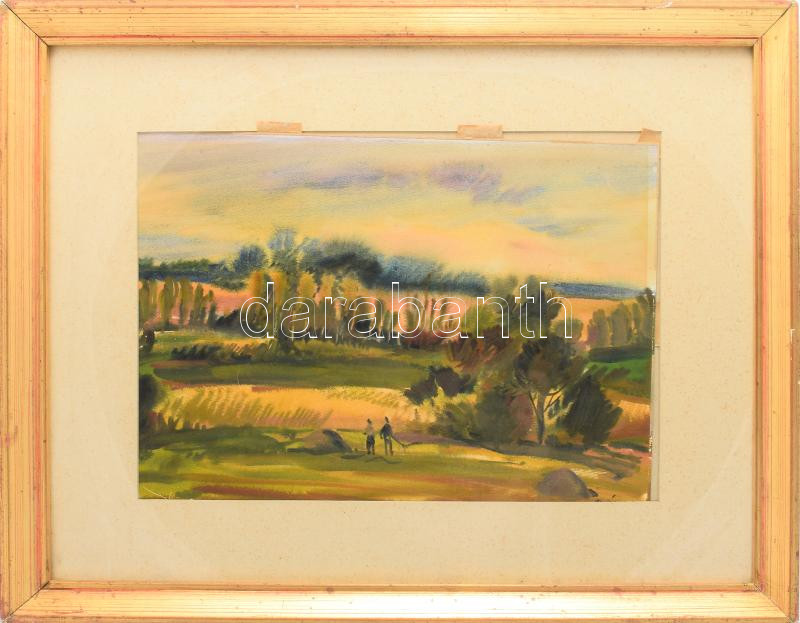 Description: Bóka Dezső (1935-): Somogyi táj, 1970-es évek vége. Akvarell, papír, jelezve jobbra lent (paszpart által kissé takarva). Hátoldalán Képcsarnok Vállalat címkéjével. Üvegezett fakeretben, hordozó paszpartuban elmozdult. 32,5x46 cm.