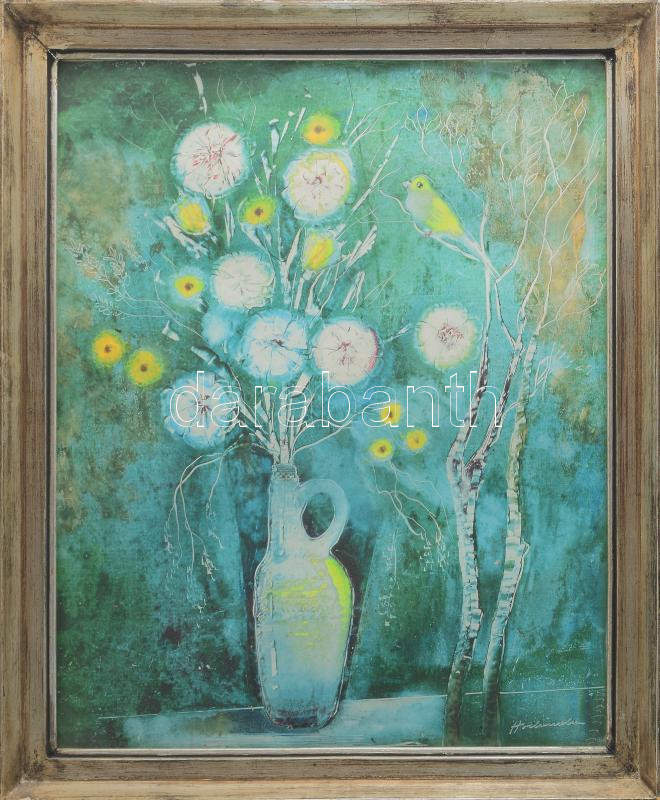 Hajós Hollanda Éva (1935-): Csendélet madárral. Olaj, műnyomó lemez, j...