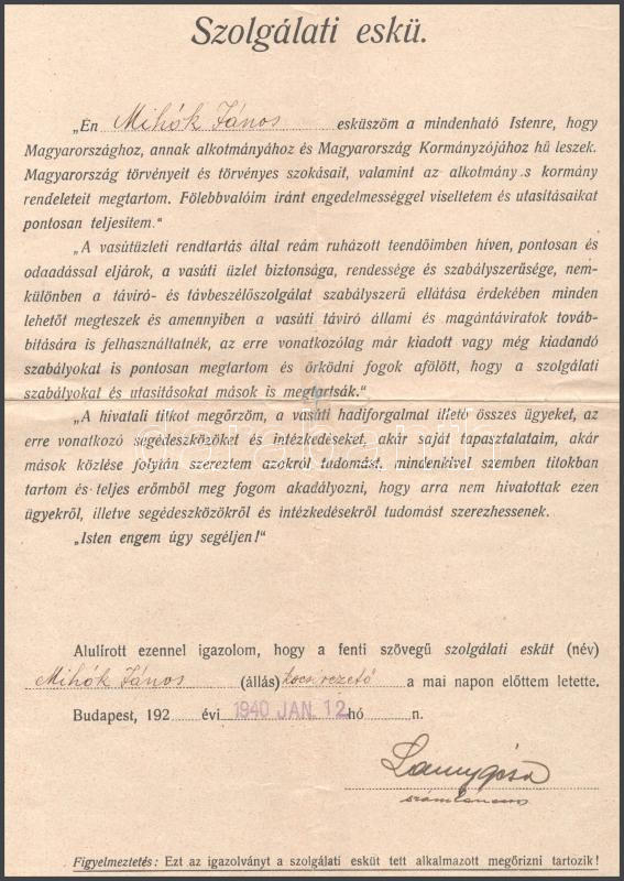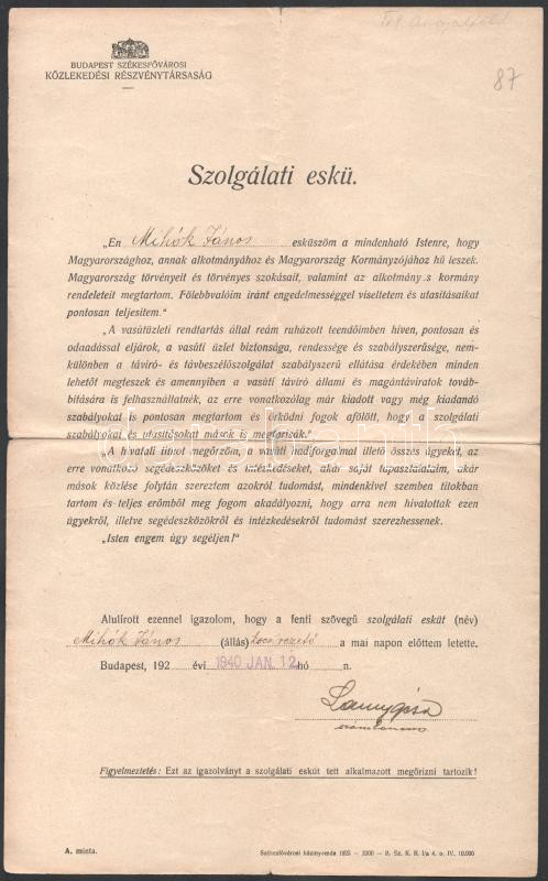 1940 BSZKRT szolgálati eskü angyalföldi villamos kocsivezetőtől