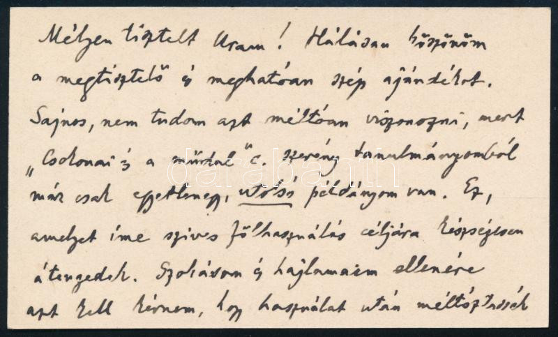 Description: 1934 Molnár Antal (1890-1983) zenetörténész, zeneszerző és zeneesztéta, brácsaművész névjegykártyája, rajta autográf soraival és aláírásával, "Sajnos, nem tudom azt méltán viszonozni, mert "...Csokonai és a műdal" c. szerény tanulmányomból már csak egyetlenegy, utolsó példányom van. ..." 6x10 cm