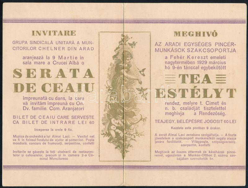 Description: 1929 Az Aradi (Erdély) Egységes Pincérmunkások Szakcsoportja által rendezendő Tea-Estély dekoratív kétlapos meghívója román és magyar nyelven, szép állapotban