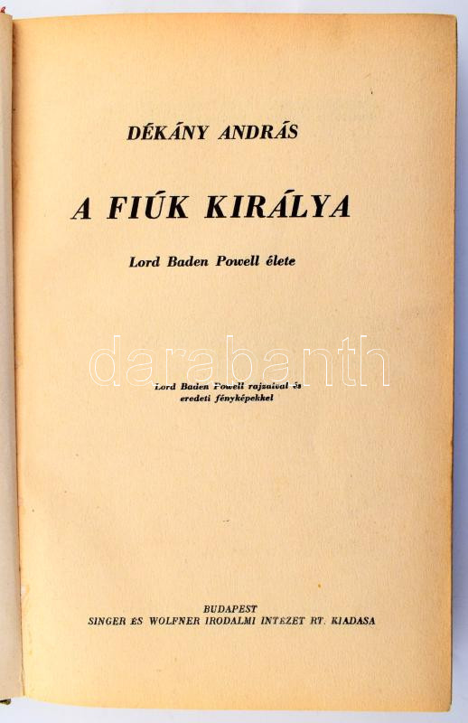 Description: Dékány András: A fiúk királya. Lord Baden Powell élete. Lord Baden Powell rajzaival és eredeti fényképekkel. Bp.,1941,Singer és Wolfner, 1 t. + 215+1 p.+ 7 t. Benne plusz egy Lord Baden Powell-ről készült képpel. Kiadói aranyozott egészvászon-kötés, kopott borítóval.