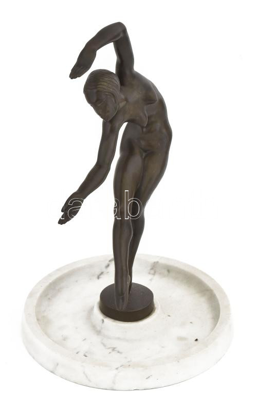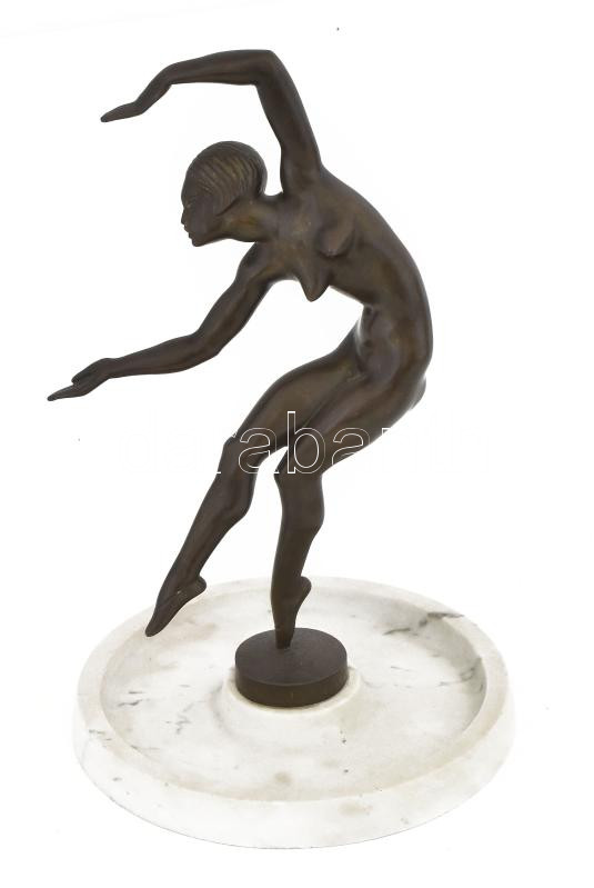 Kerényi Jenő (1908-1975): Táncosnő (Táncoló art deco nőalak), 1929-30 körül. Patinázott bronz, márvány talapzaton, jelzett: "Kerényi 1930.'' valamint "Hild'' [Hild Imre Kerényi Jenő öntőmestere volt.] m: 28,5 cm, talpazattal: 31 cm. Prov.: Hild Imre öntőmester egykori saját példánya. A szobor egy másik példánya reprodukálva: Rózsa Gyula: Kerényi Jenő 1908-1975. Bp., 2010, Glória Kiadó, 11. és 163. o. / Art deco dancer, bronze statue, another piece reproduced in the book: Rózsa Gyula: Kerényi Jenő 1908-1975. Bp., 2010, Glória Kiadó, page 11. and 163.