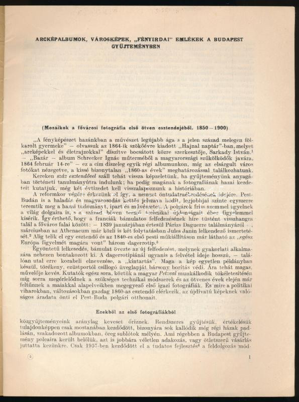 Description: Gátiné Pásztor Mária: Arcképalbumok, városképek, "fényirdai" emlékek a Budapest gyűjteményben (Mozaikok a fővárosi fotográfia első 50 esztendejéből 1850-1900). Különlenyomat a FSZEK Évkönyvéből XI. kötet 1963. Bp., 1964. Kiadói papírkötés, jó állapotban.