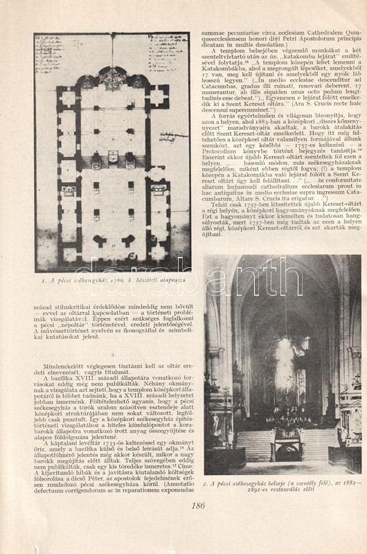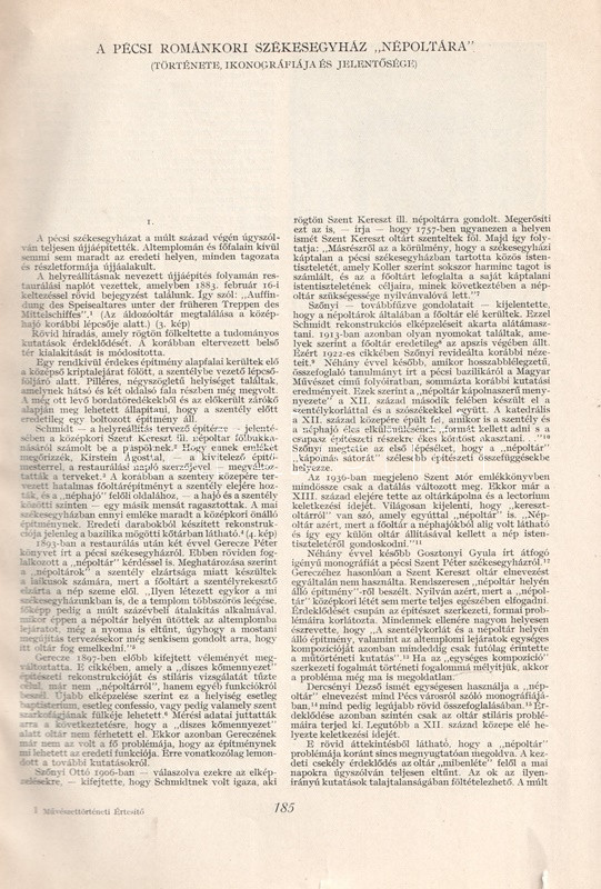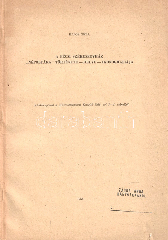 Hajós Géza (1942-2019) művészettörténész, Zádor Anna professzor tanÃtványa, elsÅ‘sorban a középkori egyházi épÃtészet történetével foglalkozott. Szövegközti felvételekkel gazdagon illusztrált tanulmánya a pécsi székesegyház 19. század végi átépÃtésekor talált egykori népoltár funkcióját vizsgálja. (A laikus hÃvek a székesegyházi fÅ‘oltár helyett a részükre fenntartott népoltárhoz járulhattak.) Az elsÅ‘ borÃtófedélen hagyatéki bélyegzés, "Zádor Anna hagyatékából" felirattal, a fedÅ‘borÃtók, illetve a belÃv leveleinek alján apró szakadásnyom.