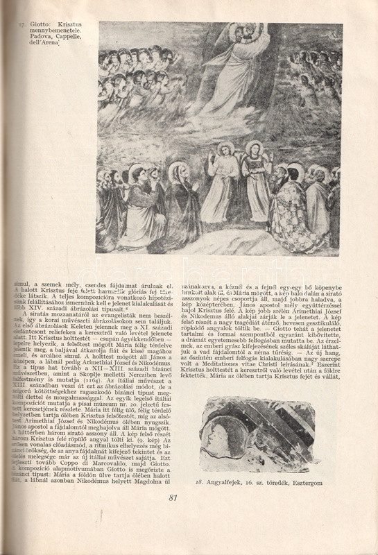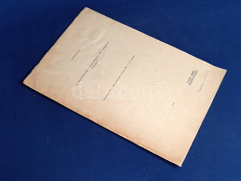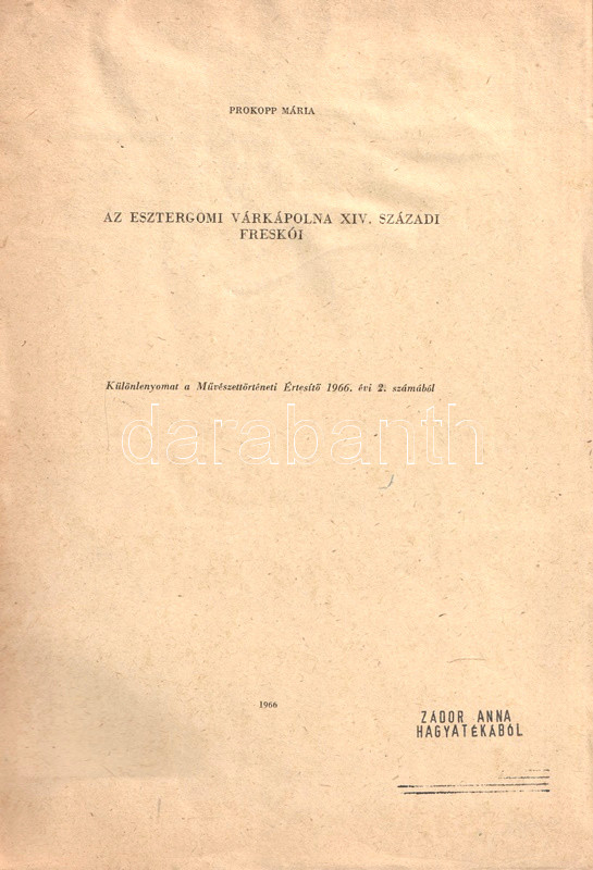 Prokopp Mária (sz. 1939) Széchenyi-díjas művészettörténész, egyetemi tanár, fő kutatási területe a XIII-XV. századi itáliai, közép-európai és magyarországi képzőművészet. Egész oldalas és szövegközti felvételekkel, ábrákkal gazdagon illusztrált tanulmányában az esztergomi várkápolna 1930 után napvilágra került freskóinak technikáját és motívumkincsét vizsgálja. A dolgozat egyértelmű összefüggést talál az itáliai trecento, a közép-európai késő gótika és az esztergomi falfestmények motívumrendszerében. Az első borítófedélen hagyatéki bélyegzés, "Zádor Anna hagyatékából" felirattal.