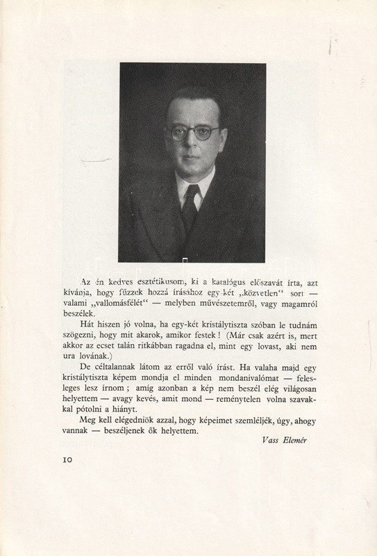 Vass Elemér (1887-1957) festőművész, az Iparművészeti Iskolában Pap Henrik tanítványa volt. Az első világháborúban hadi festőként dolgozott. Olasz és francia tanulmányutak után az Ernst-Múzeum tárlatain 1921-től szerepelt, később Zebegényben telepedett le. A posztnagybányai stílusban alkotó művész 1938. január 30-a és 1938. február 13-a között mutatkozott be a Fränkel Szalonban. A tárlaton a művész 33 festménye szerepelt; katalógusunkban hat alkotás reprodukciója szerepel, a festő munkásságát Rózsa Miklós méltatja.