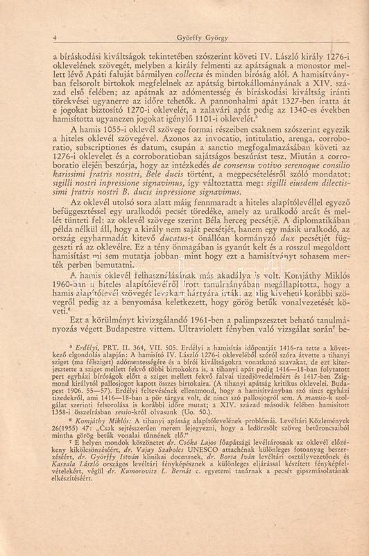Györffy György (1917-2000) történész, középkorász, az MTA tagja. Főképpen az Árpád-kor történetével foglalkozott. Az 1055-ben keletkezett Tihanyi Alapítólevéllel, első becses nyelvemlékünkkel többször foglalkozott. Rövid tanulmányában a Tihanyi Alapítólevél egy (évszázadokkal később keletkezett) hamisítvány példányával foglalkozik, amely a tihanyi apátság birtoktesteit alaposan kibővíti. A XIII. század végén keletkezett hamisítványhoz egy lényegesen korábbról való pergament használtak, melynek eredeti szövegét kivésték, és felületén helyezték el a kibővített birtokokról tanúskodó (hamis) oklevelet.