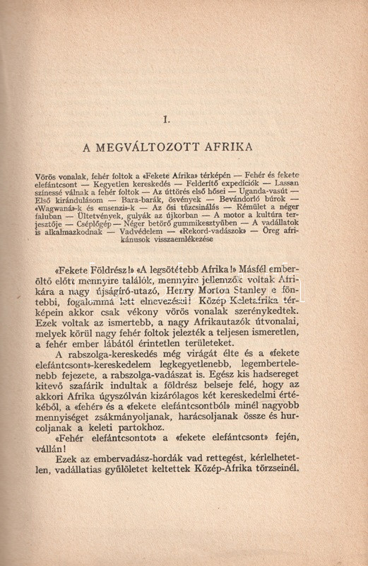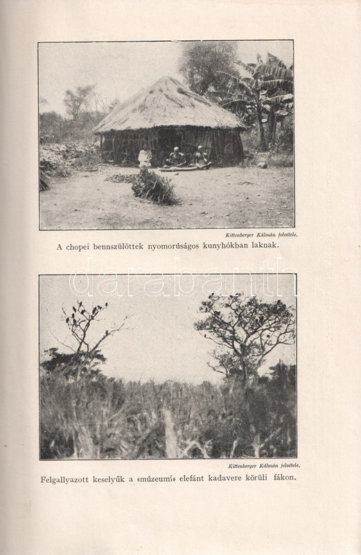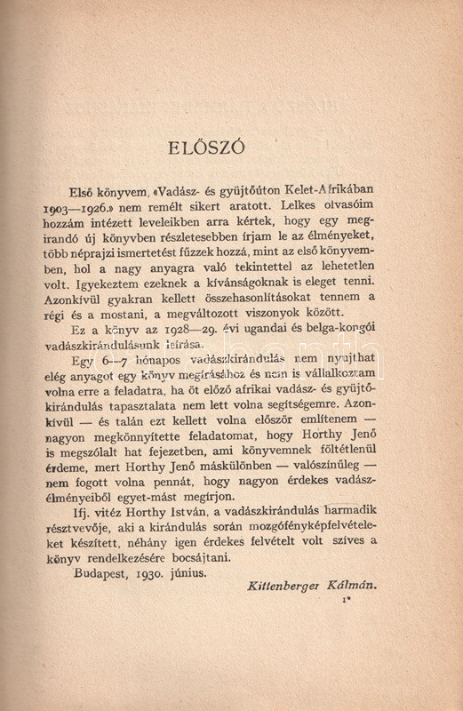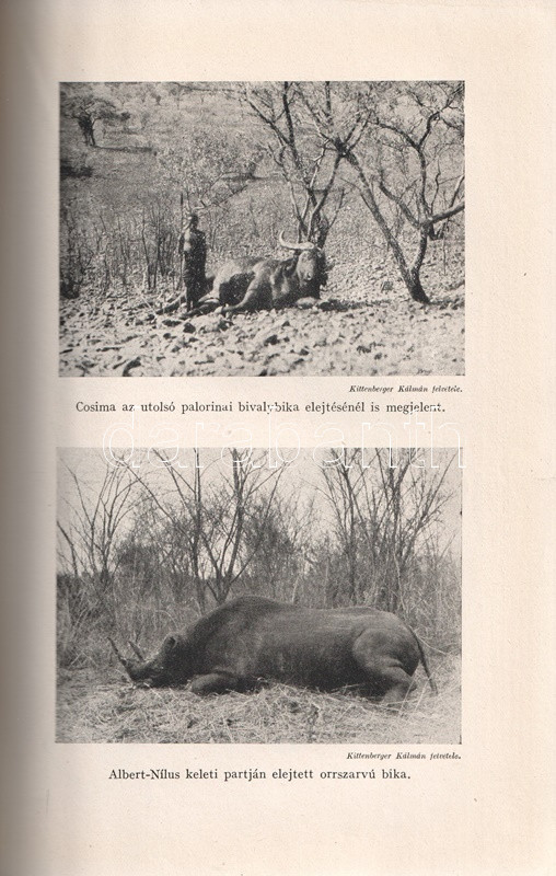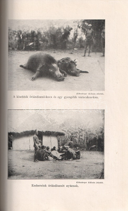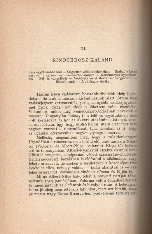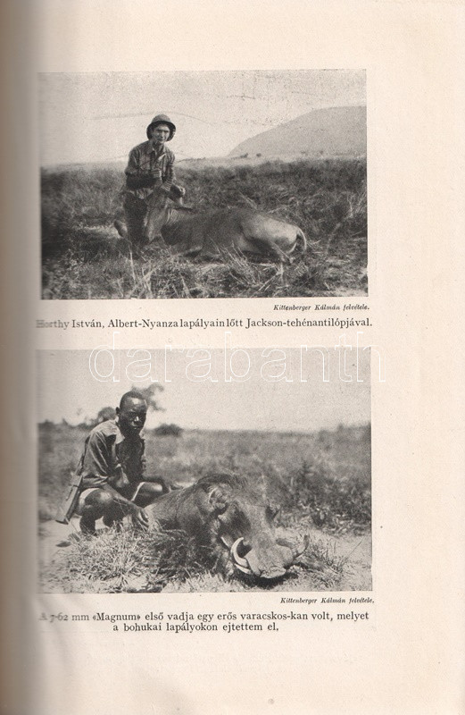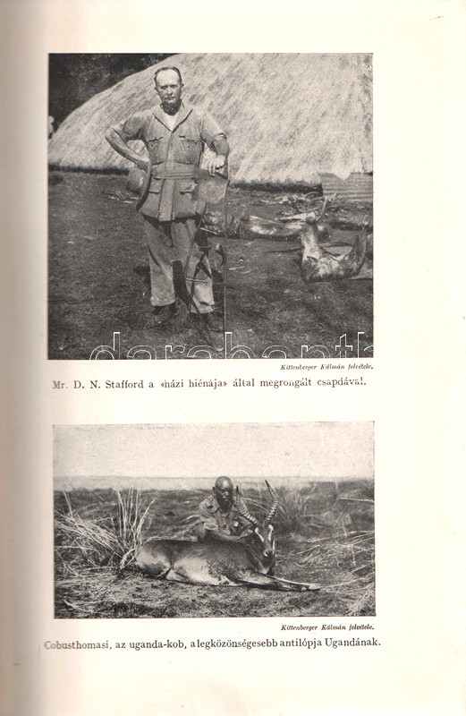 A kötet a szerző(k) 1928-1929. évi ugandai vadászkirándulásának állít emléket: a kötet hat fejezete Kittenberger Kálmán útitársának, Horthy Jenőnek írása. A vadászati beszámoló első kiadása 1930-ban jelent meg, példányunk a harmadik kiadásból származik.