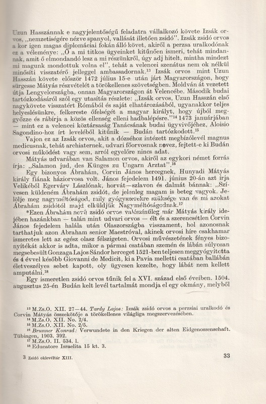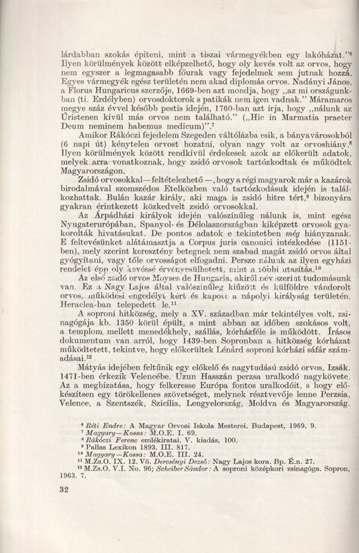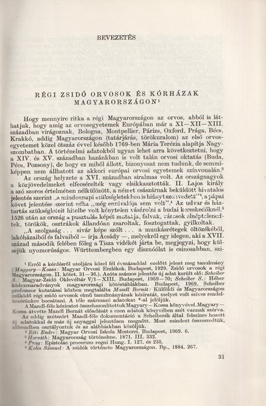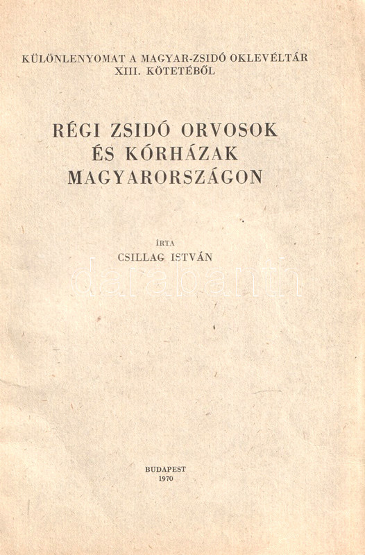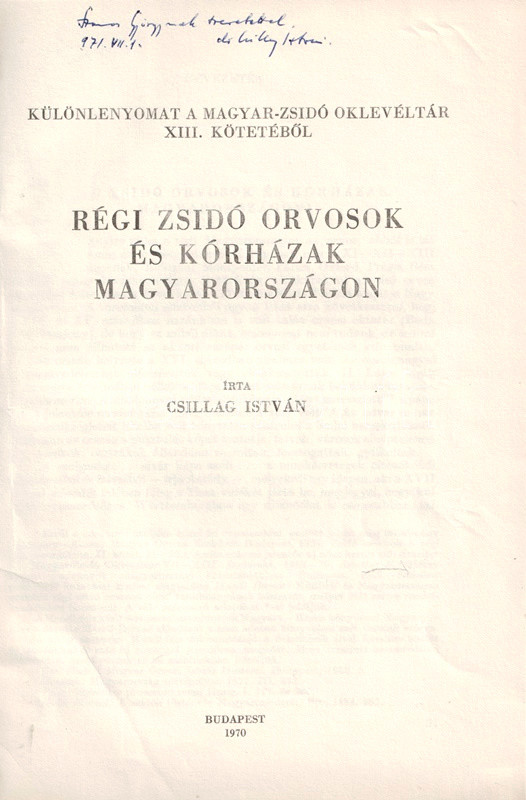 Csillag István (1913-1997) orvos, orvostörténész rövid dolgozata a magyar középkor és kora újkor általános hazai orvoshiányáról értekezik, valamint arról, hogy a hazai zsidó egyházközségek mellett miként jelentek meg az első zsidó orvosok is. Az első adat a XIV. századi Sopronból való, majd a munka végig vezet a vegyes házi királyok, a török kor, majd a XVII-XVIII. század tematikus orvostörténetén.
