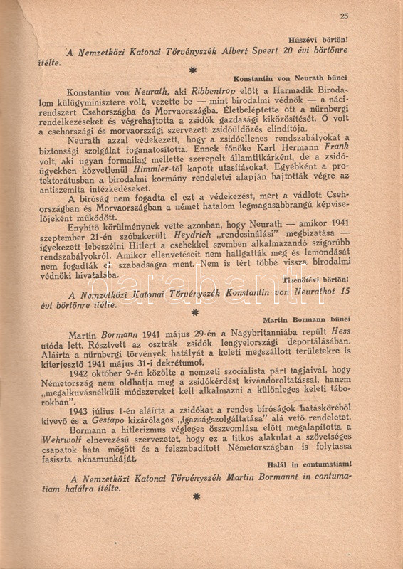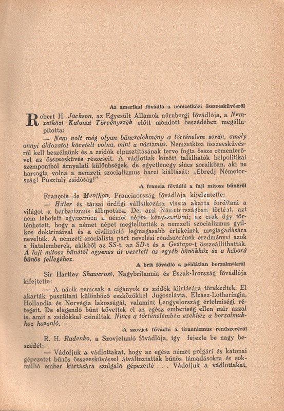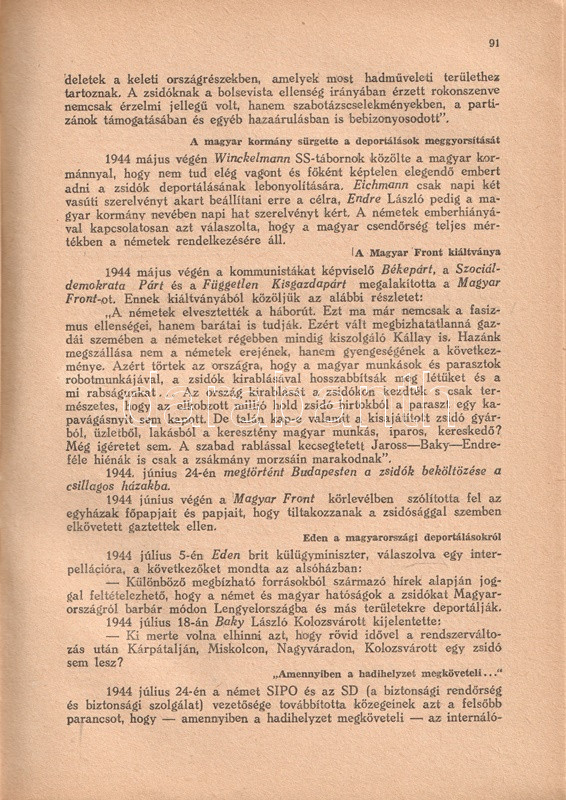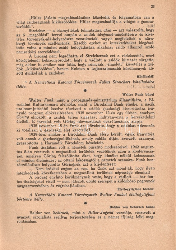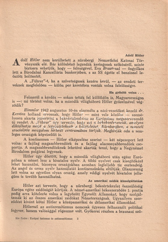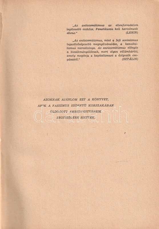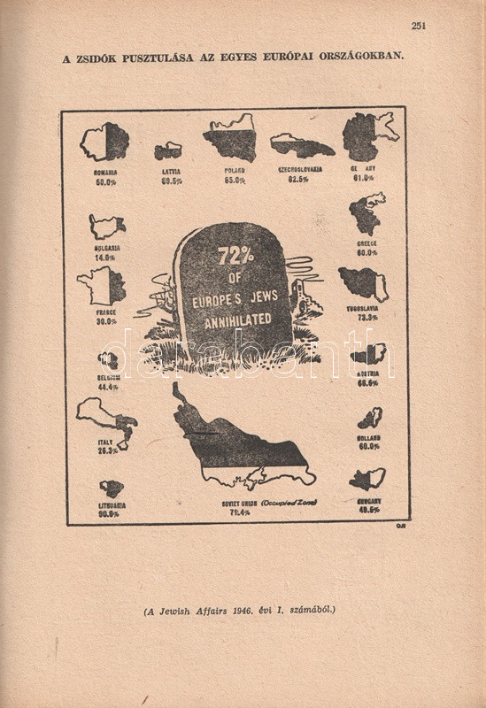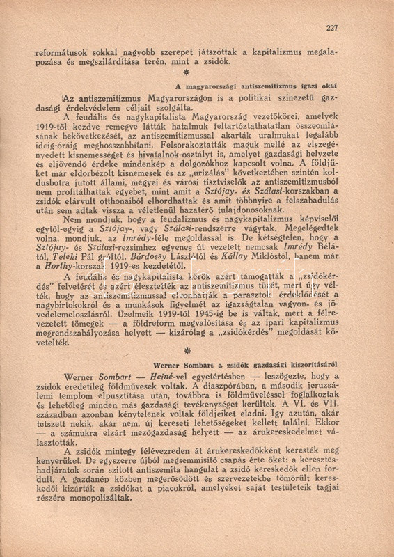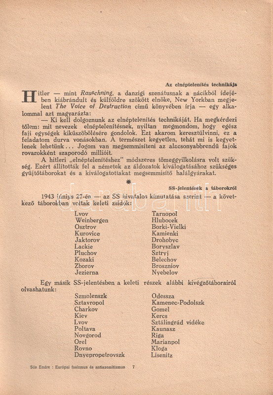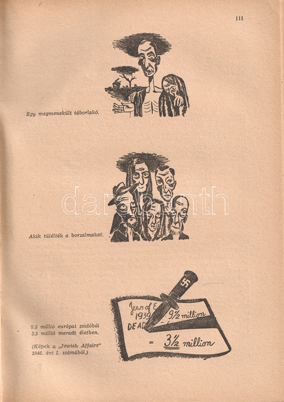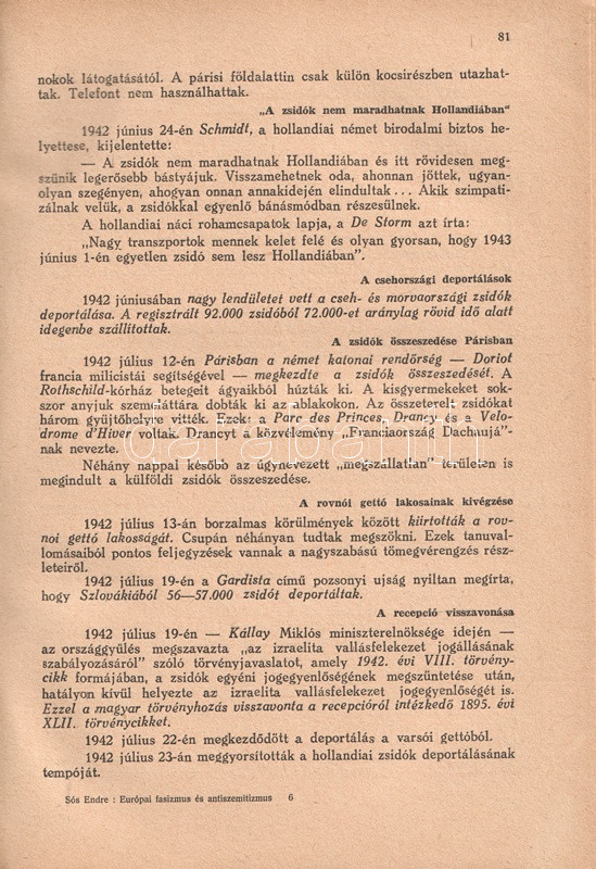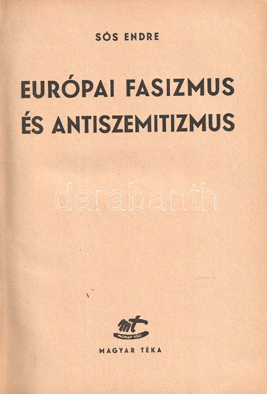 Sós Endre (1905-1969) író, újságíró, szerkesztő, hitközségi elnök. A munkaszolgálatot megjárt szerző monográfiája az európai zsidóság tragédiájához vezető út állomásait vizsgálja az antiszemitizmus elterjedésétől a holokausztig. Oldalszámozáson belüli statisztikai adatokkal, szövegközti ábrákkal.