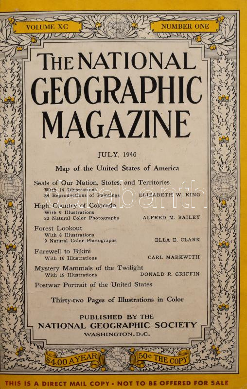 1946 The National Geographic Magazine. Vol. XC, No. 1, 2, 4. [1946. júliusi, augusztusi, októberi számok egybekötve]. Washington D.C., 1946, The National Geographic Society. Fekete-fehér és színes képekkel illusztrálva. Angol nyelven. Egészvászon-kötésben, kissé viseltes borítóval, sérült gerinccel, néhány kissé sérült lappal.