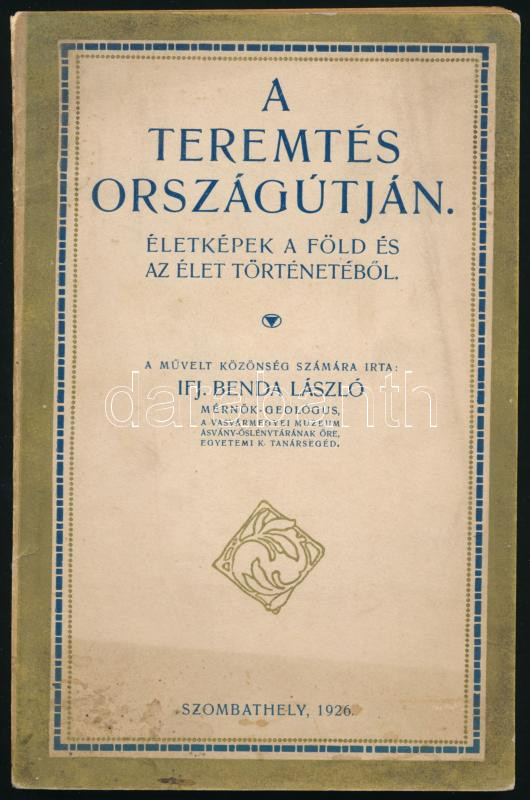Description: [Bendefy] Benda László, ifj.: A teremtés országútján. Életképek a Föld és az élet történetéből. Szombathely, 1926, Dunántúli Nyomdavállalat Rt., 81+(3) p. Átkötött félvászon-kötésben, nagyrészt jó állapotban.
