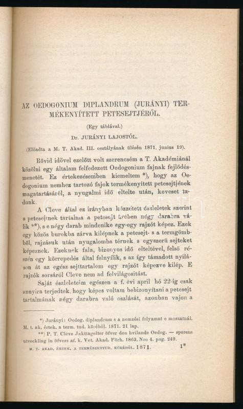 Jurányi Lajos: Oedogonium Diplandrum s a nemzési folyamat e moszatnál. Rajzokkal két táblán. Pest, 1871. Eggenberger 24 p. + 2 t (litográfiák). Későbbi papírborítóval