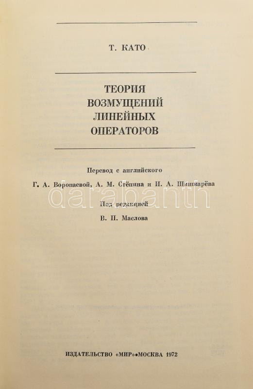 Tosio Kato: Perturbation Theory for Linear Operators. Moszkva, 1972, Izdatelstvo Mir, 740 p. Orosz nyelven. Kiadói műbőr-kötés. / In Russian language. Hardcover.