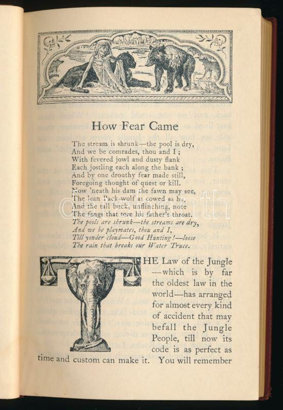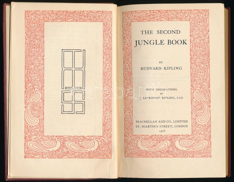 Kipling, Rudyard: The Second Jungle Book. With Decorations by J. Lockwood Kipling, C.I.E. London, 1926, Macmillan and Co. Ltd., 4 sztl. lev.+ 299+(3) p. Angol nyelven. Kiadói aranyozott egészbÅ‘r-kötés, a borÃtó és a lapok sarkán kisebb ázásnyommal. / In English language. Leather-binding, with minor stains.