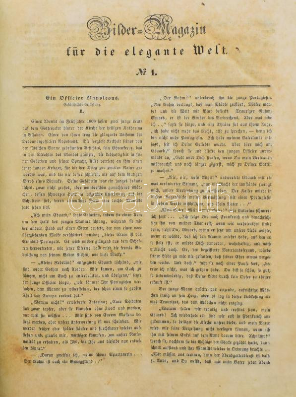 Description: ca 1835 Bilder-Magazin für die elegante Welt Diezmann, A. (ed.) Leipzig: Industrie-Comptoir (Baumgärtner) No 1-26. A német divatlap első félévi számai egybe kötve, a szövegközti metszetekkel korabeli kartonált kötésben / Half year issues in contemporary paper binding.