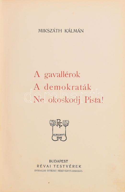 Mikszáth munkái, 4 db: A tekintetes vármegye; A gavallérok; Ne okoskod... https://www.darabanth.com/en/504-Online-auction/504.0/Books/Books-Other-rarities~2500040/Mikszath-munkai-4-db-A-tekintetes-varmegye-A-gavallerok-Ne-okoskodj-Pista-A-demokratak-M~II3422401