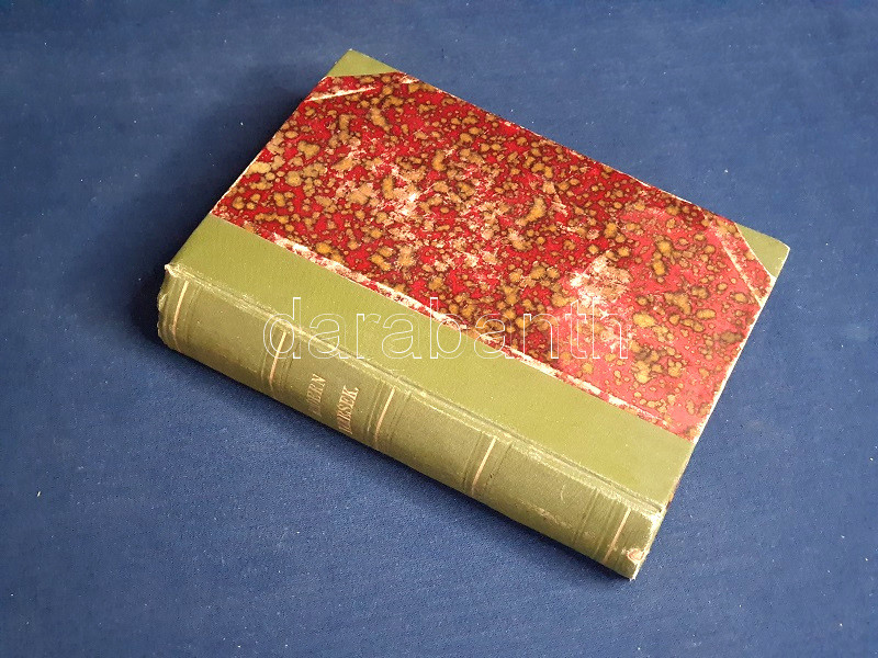 Aranyozott gerincű, enyhén kopott korabeli félvászon kötésben (Dötzkirchner Miksa, Pécs), márványmintás festésű lapszélekkel. Jó példány.