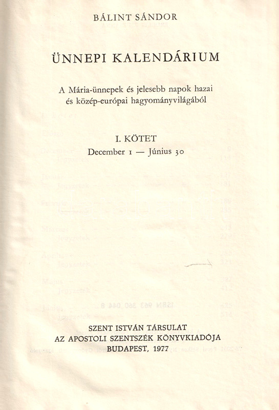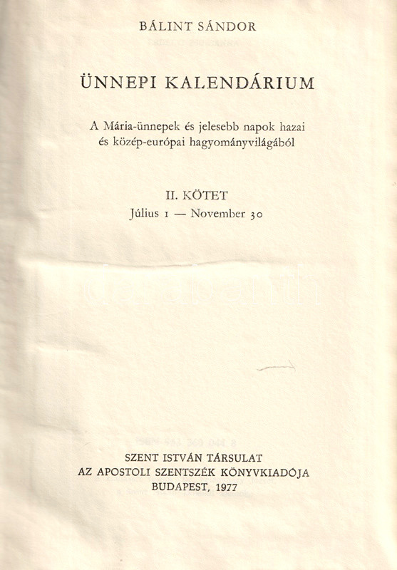 Bálint Sándor: Ünnepi kalendárium. A Mária-ünnepek és jelesebb napok hazai és közép-európai hagyományvilágából. I-II. kötet. (I. kötet: december 1. - június 30. II. kötet: július 1. - november 30.) [Teljes mű két kötetben.]