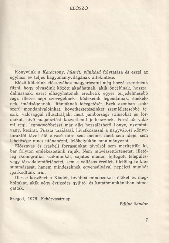 Bálint Sándor (1904-1980) néprajzkutató monográfiája a katolikus népi vallásosság hagyományvilágát ismerteti. A szentek névnapjának sorrendjében összeálló munka valamennyi fejezete a szentlegendán kívül ismerteti a kapcsolódó képzőművészeti feldolgozásokat, valamint a kapcsolódó katolikus népszokásokat és népi énekeket is, egyes legendák fölöttébb változatos helyi változataira is kitérve. Témafeldolgozása bőven túlmerészkedik a határokon, értelemszerűen az erdélyi, délvidéki és felvidéki hagyományokat is feldolgozza.