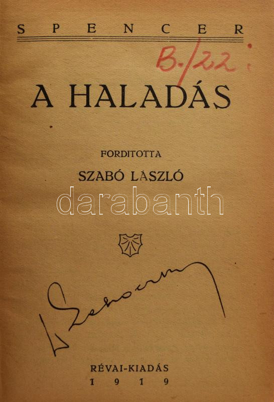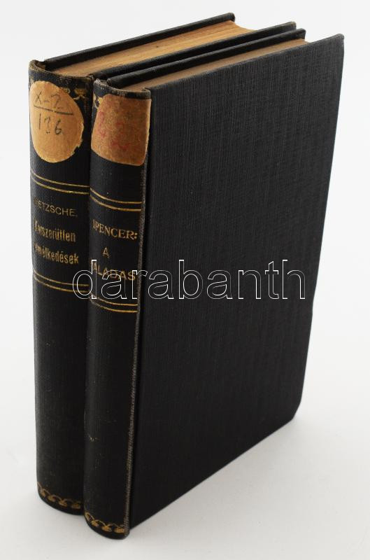 Világkönyvtár sorozat 2 kötete: Spencer, [Herbert]: A haladás. Ford.: Szabó László.; Nietzsche, [Friedrich]: Korszerűtlen elmélkedések. Ford.: Miklós Jenő és Wildner Ödön. Bp., 1919-1921, Révai, 234+(6) p.; 348+(4) p. Átkötött egészvászon-kötésben, néhány kissé sérült lappal. Mindkét kötetben Dr. Lehoczky Győző (1904-2003) orvos, az Országos Onkológiai Intézet osztályvezető főorvosa autográf névbejegyzésével és ex libris-szével.