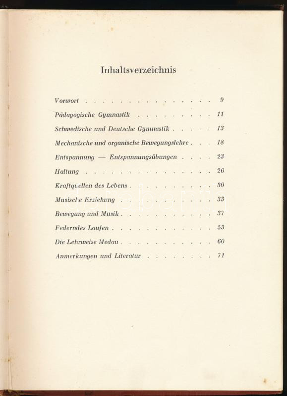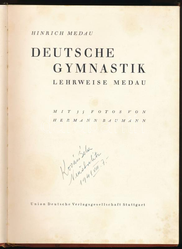 Medau, Hinrich: Deutsche Gymnastik. Lehrweise Medau. Stuttgart, 1940, Union Deutsche Verlagsgesellschaft, 1 t.+ 71+(1) p.+ 17 (kétoldalas) t. Fekete-fehér fotókkal illusztrálva. Német nyelven. Kiadói egészvászon-kötés, kissé viseltes borítóval és gerinccel, helyenként kissé foltos lapokkal, tulajdonosi bejegyzéssel.