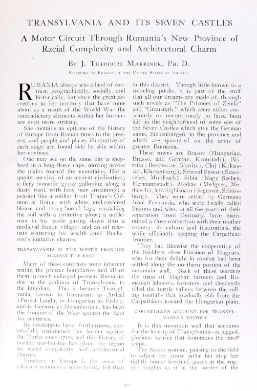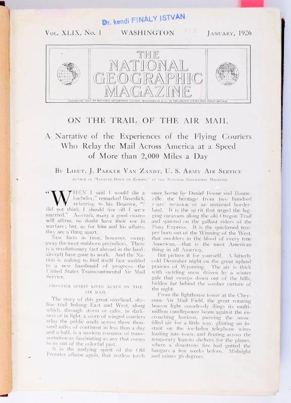 1926 The National Geographic Magazine. Vol. XLIX, No. 1. January 1926. Washington D.C., 1926, The National Geographic Society. Fekete-fehér és színes képekkel illusztrálva. Angol nyelven. Benne J. Theodore Marriner: Transylvania and its Seven Castles - A Motor Circuit Through Rumania's New Province of Racial Complexity and Architectural Charm c. írásával. Átkötött félvászon-kötésben, kopottas borítóval, kendi Finály István (1876-1947) mérnök tulajdonosi bélyegzőjével.