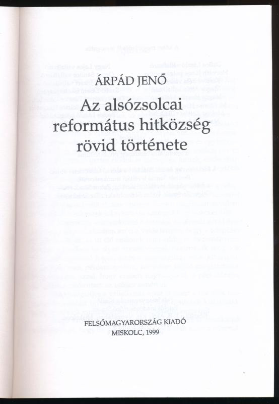 Árpád Jenő: Az alsózsolcai református hitközség rövid története. Miskolc, 1999. Felsőmagyarországi kiadó. 101p. Kiadói papírkötésben.