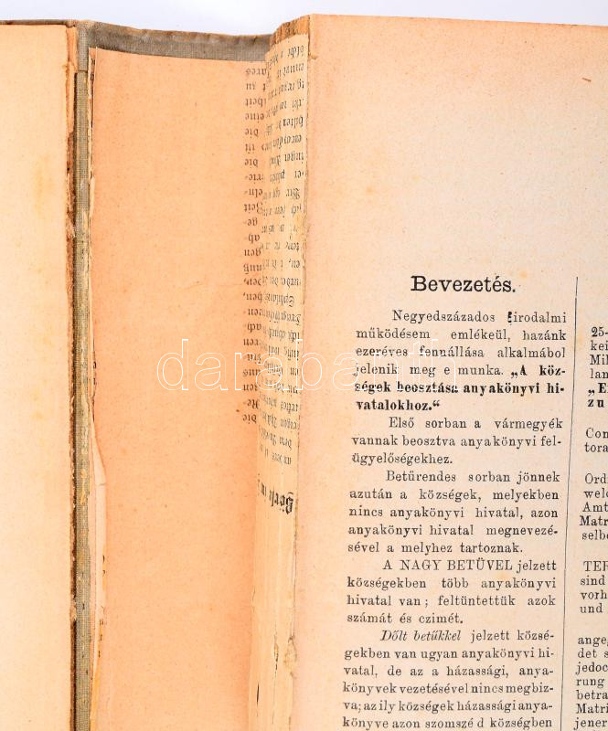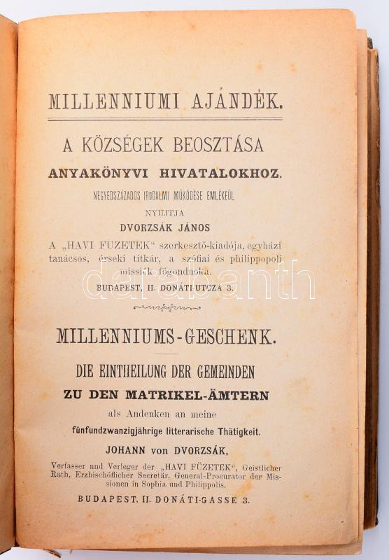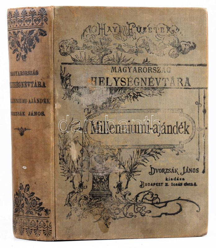 Dvorzsák János: Magyarország helységnévtára. A községek beosztása anyakönyvi hivatalokhoz. Millenniumi ajándék. Függelék: Változások és sajtóhibák. Bp., [1895], Dvorzsák János, 567+(1) p.; 241+(7) p. Egészvászon-kötésben, viseltes, foltos, a könyvtesttől részben elváló borítóval, helyenként foltos lapokkal, néhány a fűzéstől elváló lappal.