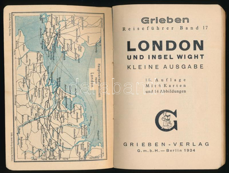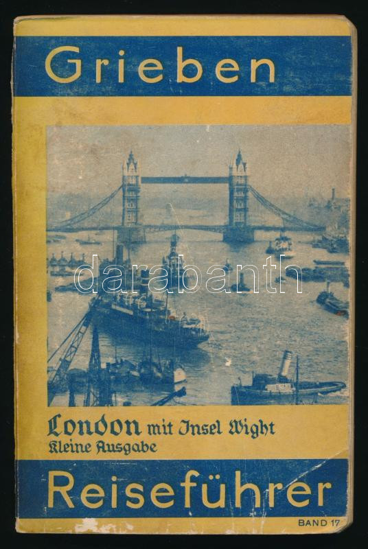 London und Insel Wight. Kleine Ausgabe. Grieben Reiseführer Band 17. Berlin, 1934, Grieben-Verlag, 167+(1) p.+ 3 (kihajtható) t.; 20+(2) p.+ 1 (kihajtható, nagyméretű térkép) t. Német nyelven. Kiadói papírkötés, kissé viseltes, kopottas borítóval.
