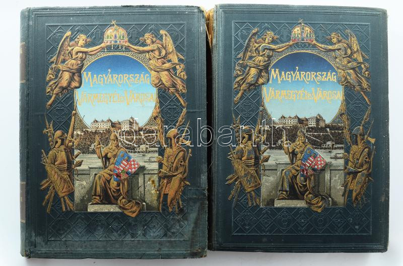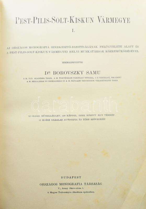 Pest-Pilis-Solt-Kiskun vármegye I-II. kötet. Szerk.: Dr. Borovszky Samu. Magyarország vármegyéi és városai. Magyarország monográfiája. Bp.,(1910), Országos Monográfia Társaság, (Légrády-ny.) 577p., 488 (2)p. Kiadói aranyozott, festett egészvászon-kötés, Gottermayer-kötés, festett lapélekkel, kopásokkal, a 2. kötet sérült gerinccel,