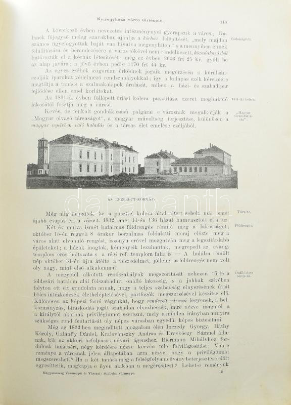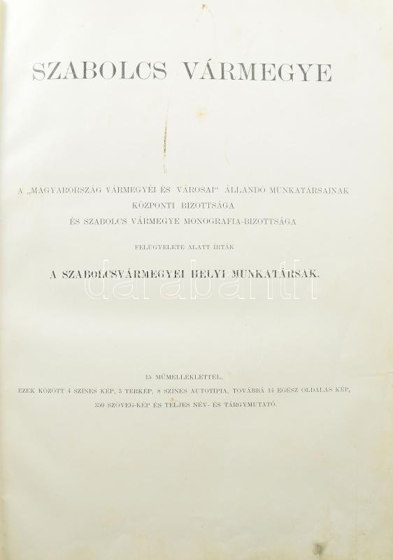 Szabolcs vármegye. Szerk.: Dr. Borovszky Samu. Magyarország vármegyéi és városai. Magyarország monografiája. Bp.,(1900), Apollo,(Légrády-ny.),XV+574 p. +12 (közte 4 színes tábla) t. + 2 (Szabolcs vármegye térképe, Nyíregyháza térképe) t. Kiadói aranyozott, festett, dombornyomott, illusztrált egészvászon-kötés, Leszik-kötés, színezett lapszélekkel, kissé kopott borítóval, a gerincen kopásokkal, az előzéklapon beírással, néhány lap foltos.