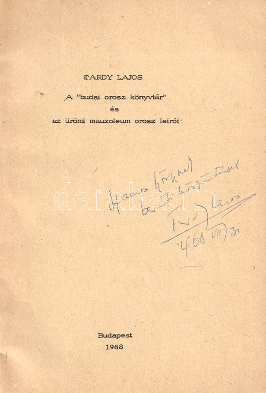 Dedikált: "Szamos Györgynek baráti köszöntéssel: Tardy Lajos. 968. VII. 30".