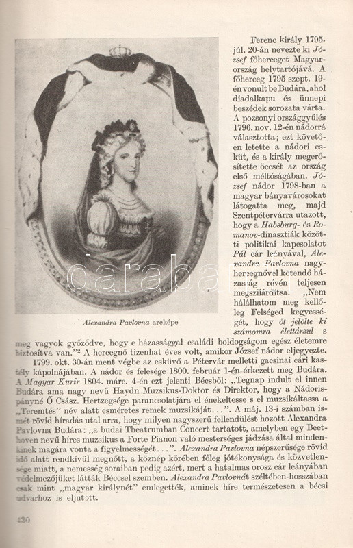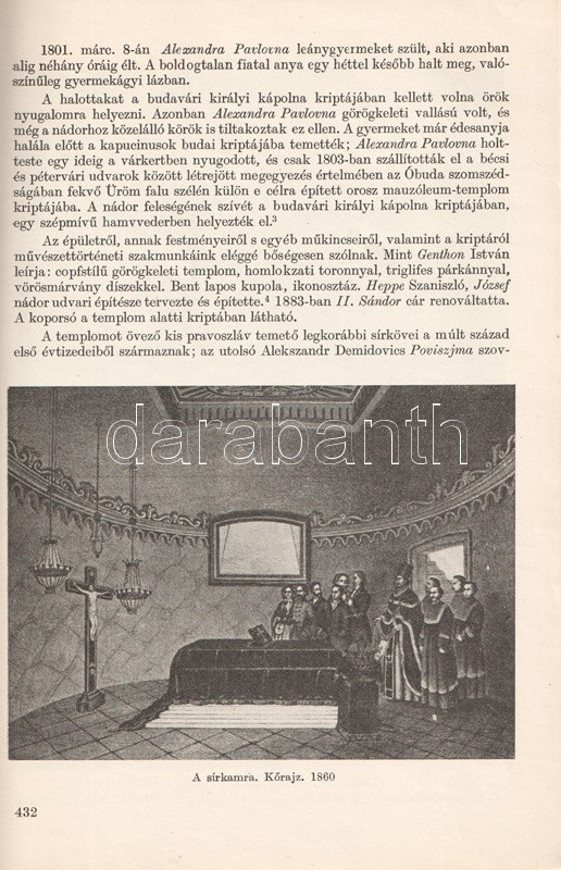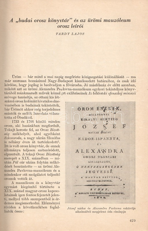 Tardy Lajos (1914-1990) szovjet hadifogságot megjárt művelődéstörténész, műfordító, az Országos Széchényi Könyvtár kutatója. Szövegközti képekkel gazdagon illusztrált munkája a klasszikus (18/19. századi) századforduló orosz-magyar kapcsolatainak egy érdekes példáját járja körül. A Habsburg-család magyar ágának tagja, József nádor a napóleoni idők szövetségi rendszere jegyében 1799-ben elvette a cári család sarját, Alekszandra Pavlovna orosz nagyhercegnőt. A Pest-Buda-szerte népszerűnek számító ifjú ara József nádor ürömi birtokán élt, 1801. évi halála után itt is temették el, sírja fölé mauzóleumot emeltek, gondozására pedig jelentős forrást biztosított a Romanov-család. Az összegből nem csupán kisebb ortodox plébániára telt, hanem nagyobb könyvtárt is létesítettek az elhunyt nagyhercegnő könyvtárának felhasználásával. Az ürömi birtok hamarosan a hazai orosz közösség találkozóhelyévé vált.