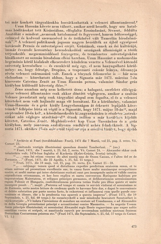 Tardy Lajos (1914-1990) szovjet hadifogságot megjárt művelődéstörténész, műfordító, az Országos Széchényi Könyvtár kutatója. Rövid munkájában Caterino Zeno velencei követ (1435 körül - 1490 körül) utazását dolgozza fel. Caterino Zeno velencei patrícius követjárásának célja a perzsa-grúz területeket uraló Uzun Hasszán emírrel való kapcsolatfelvétel volt: a mohamedán uralkodó ebben az időben többször mért csapást török hadakra a Kaukázus előterében. Caterino Zeno első európai utazóként értékes feljegyzéseket készített a korabeli Hasszán-udvarról, illetve a Kaukázus vidékének törökellenes politikájáról. A velencei utazó a visszaúton felkereste a törökellenes szövetséget tervező Mátyás udvarát is. Caterino Zeno követjárásainak eredeti szövege elveszett, szövegét leszármazottjai töredékesen adták ki. Tanulmányunk a jeles velencei követ és utazó egykori útjának rekonstruálására tesz kísérletet, mely a törökellenes keleti magyar diplomácia szempontjából is számottevő.