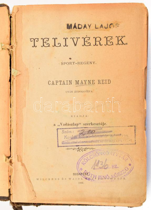 Mayne Reid: Telivérek. Sport-regény. Captain - - után átdolgozva. Bp., 1882., Wilckens és Waidl, 152 p. Hozzá kötve: Timár Szaniszló: Az arany-borju. Monte-carlói történetek. Bp., 1893, Markovits és Garai, 102+1 p. Átkötött félvászon-kötés, kopott borítóval, sérült, hiányos gerinccel, sérült kötéssel és kijáró lapokkal.